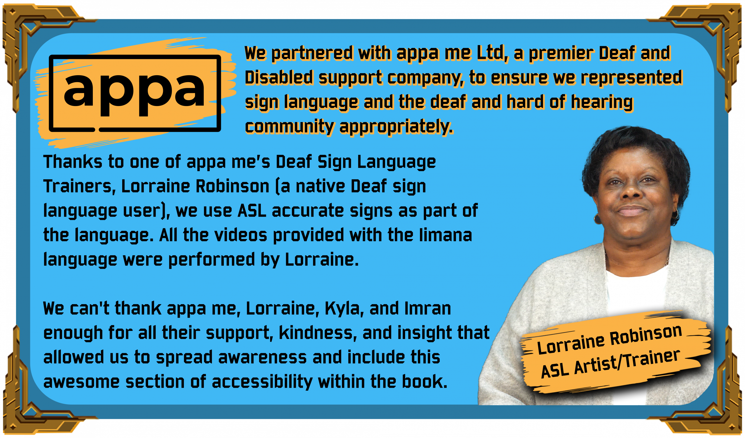 We based Iimana (Unsettled Language) on a sign language to spread Deaf awareness and accessibility. By allowing Players and GMs to learn American Sign Language (ASL) in a fun, relaxed setting like the TTRPG table, we hope more people around the world will be able to communicate with those who are Deaf or Hard of Hearing.