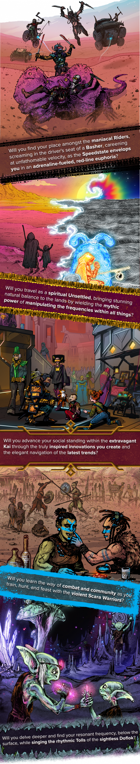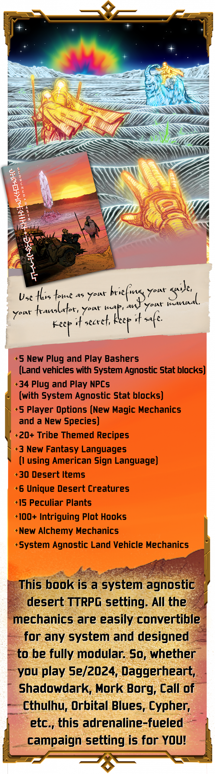 New Systems: Throughout your journeys across the scalding sands, you will have opportunities to learn epic new skills and gain cultural Player Options. These mechanical additions can work alongside any TTRPG system. So, will you: