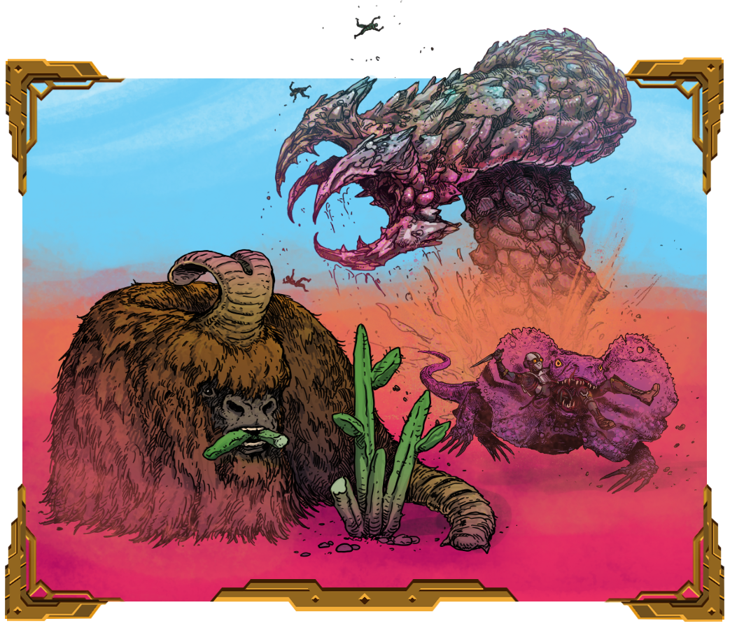 No desert setting is complete without captivating Flora and Fauna that’s either trying to kill you or aid your adventures. A myriad of never-before-seen creatures and plant life inhabit each terrain. We have also included some fan favorites, like the MONSTROUS Dune Eaters (our version of Giant Sandworms)!