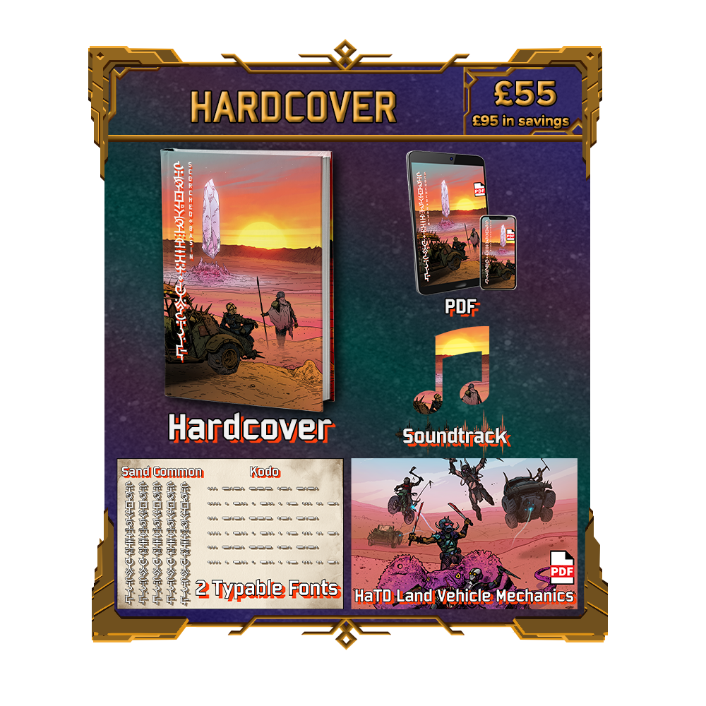 This product contains all of the physical rewards and downloadable digital rewards that come with the Scorched Basin Hardcover Tier. More details below…