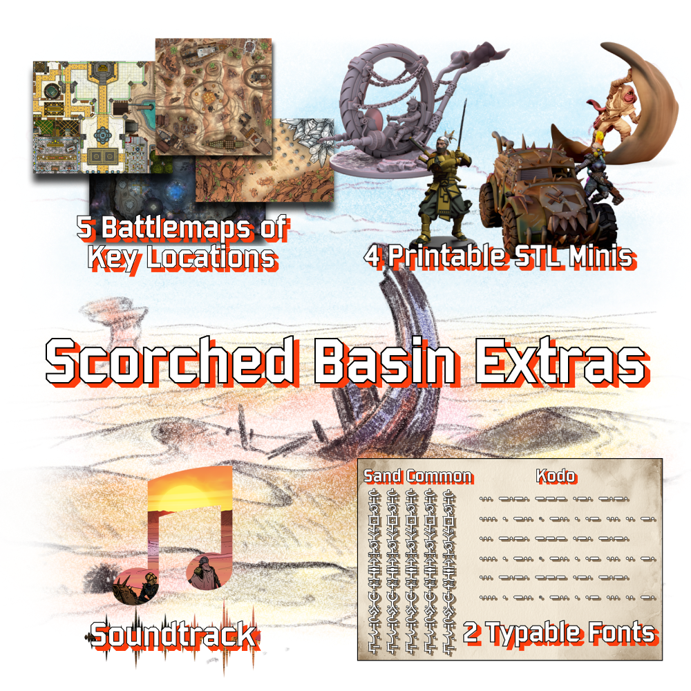This purchase contains the following digital products: 5 Digital Battle Maps (15 layers) Scorched Basin Soundtrack 4 Miniature STLs (35mm and 75mm) 2 Typable Fantasy Fonts