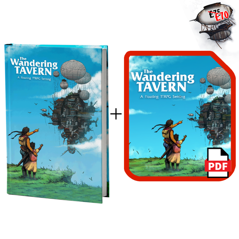 The Wandering Tavern is a 200+ page travellers’ guide to an expansive Studio Ghibli inspired floating TTRPG setting. Explore this immense soaring city with 15 battle maps that detail its every nook and cranny. Delve deep into the devious underbelly of the Tavern while getting to know its wide range of unique NPC patrons and staff. The Wandering Tavern’s dark mysteries and entangled truths are yours to unlock. While traversing this vast metropolis use remarkable magical items to protect yourself from the twisted Spirits stalking the halls. However, if you have to escape, you can glide through uncharted skies on never-before-seen Zephyrs, constructed from a plethora of brand-new Parts and Stations.